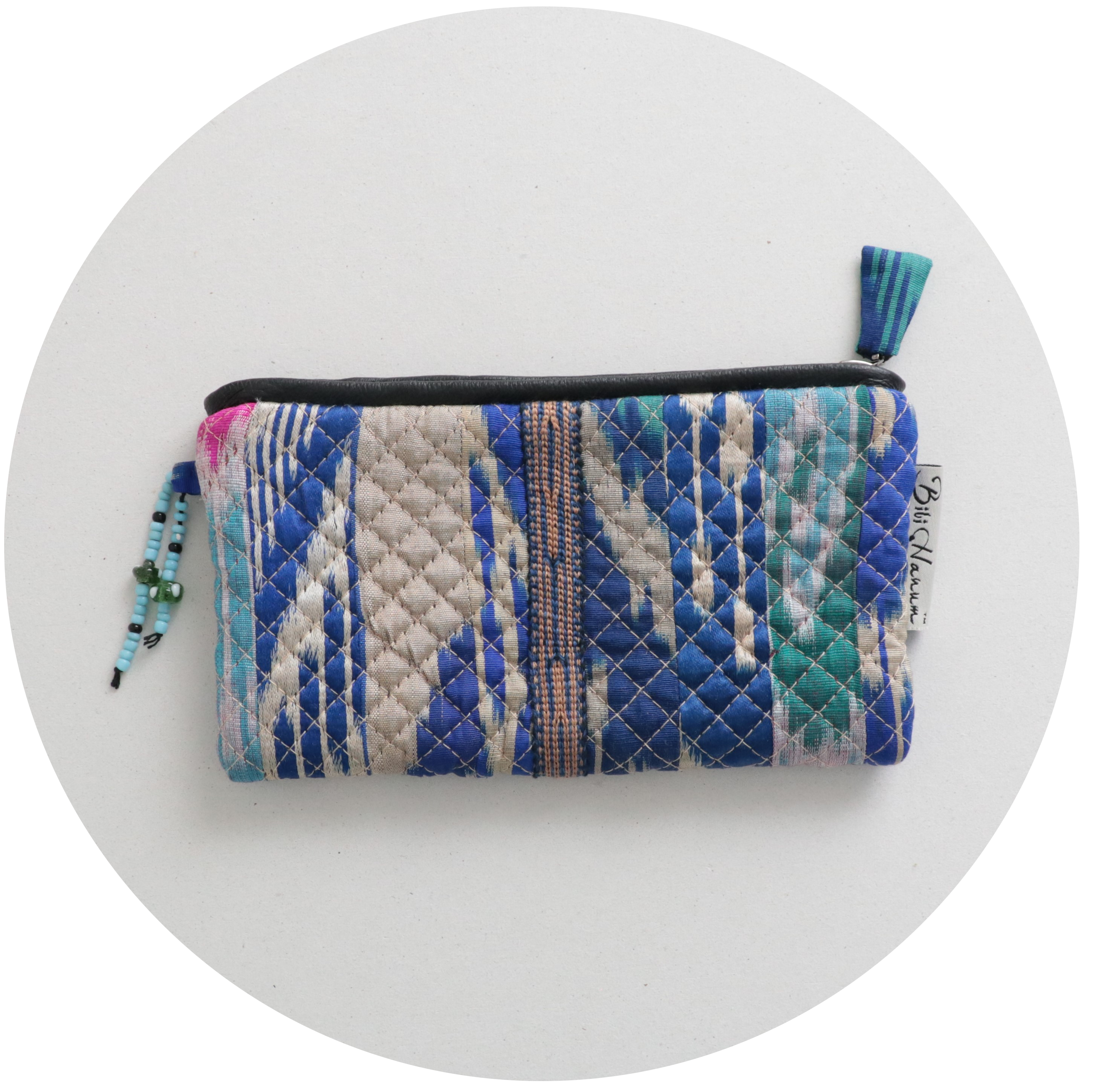 手織りイカット(絣)の端布をパッチワークにし、キルティング加工してポーチにしました。織り紐ジヤクをアクセントに、裏地にはベカサム織り(伝統的な縞模様生地)を使い、丁寧に仕上げています。