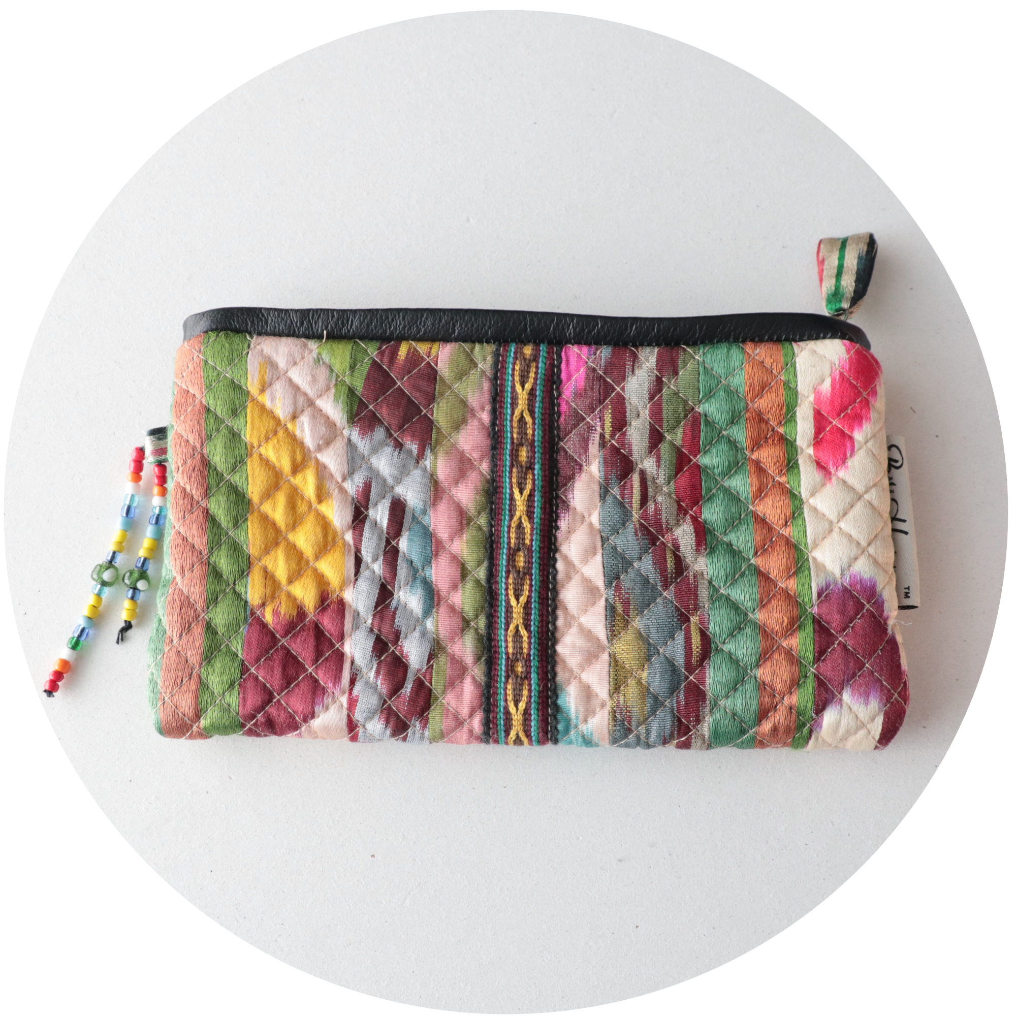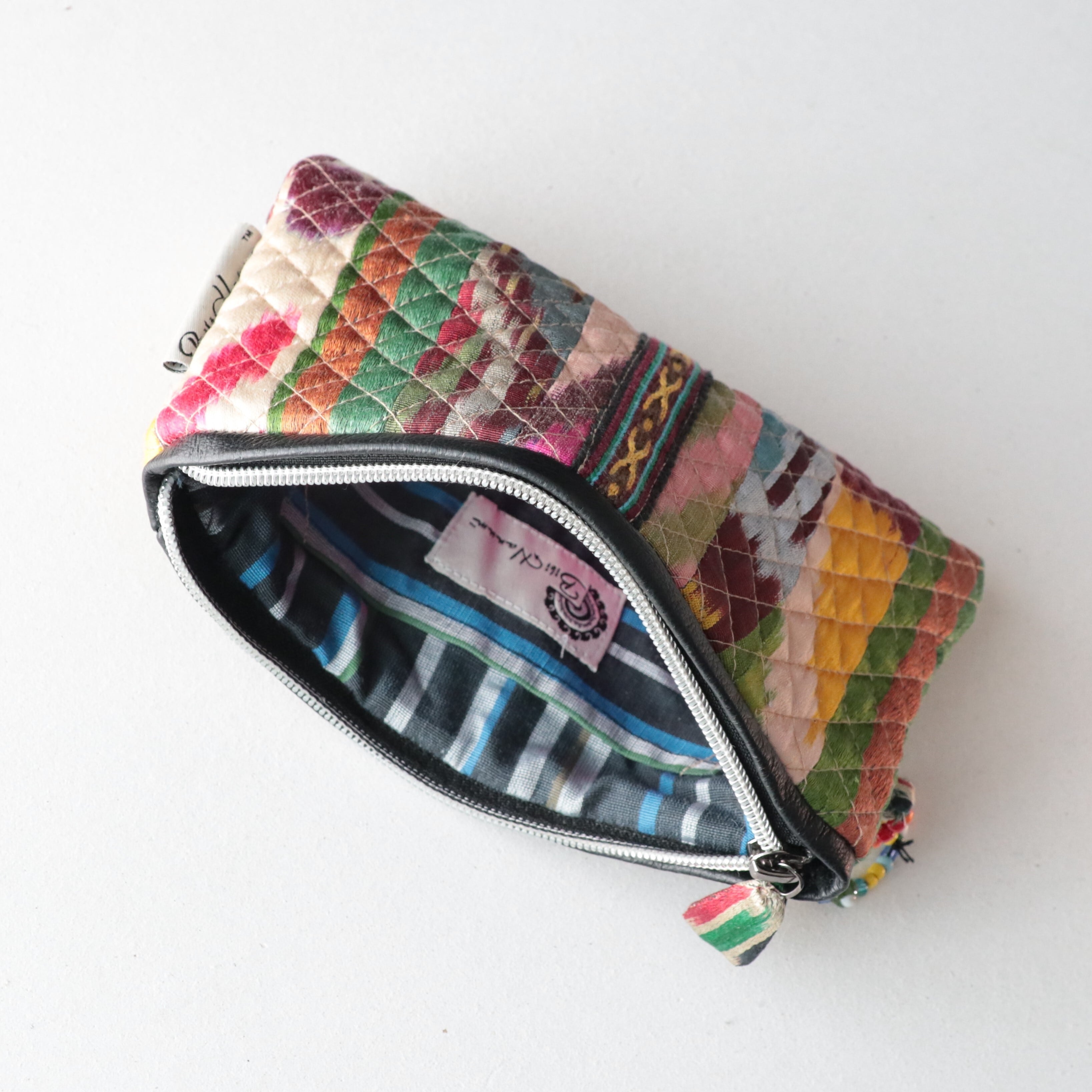 手織りイカット(絣)の端布をパッチワークにし、キルティング加工してポーチにしました。