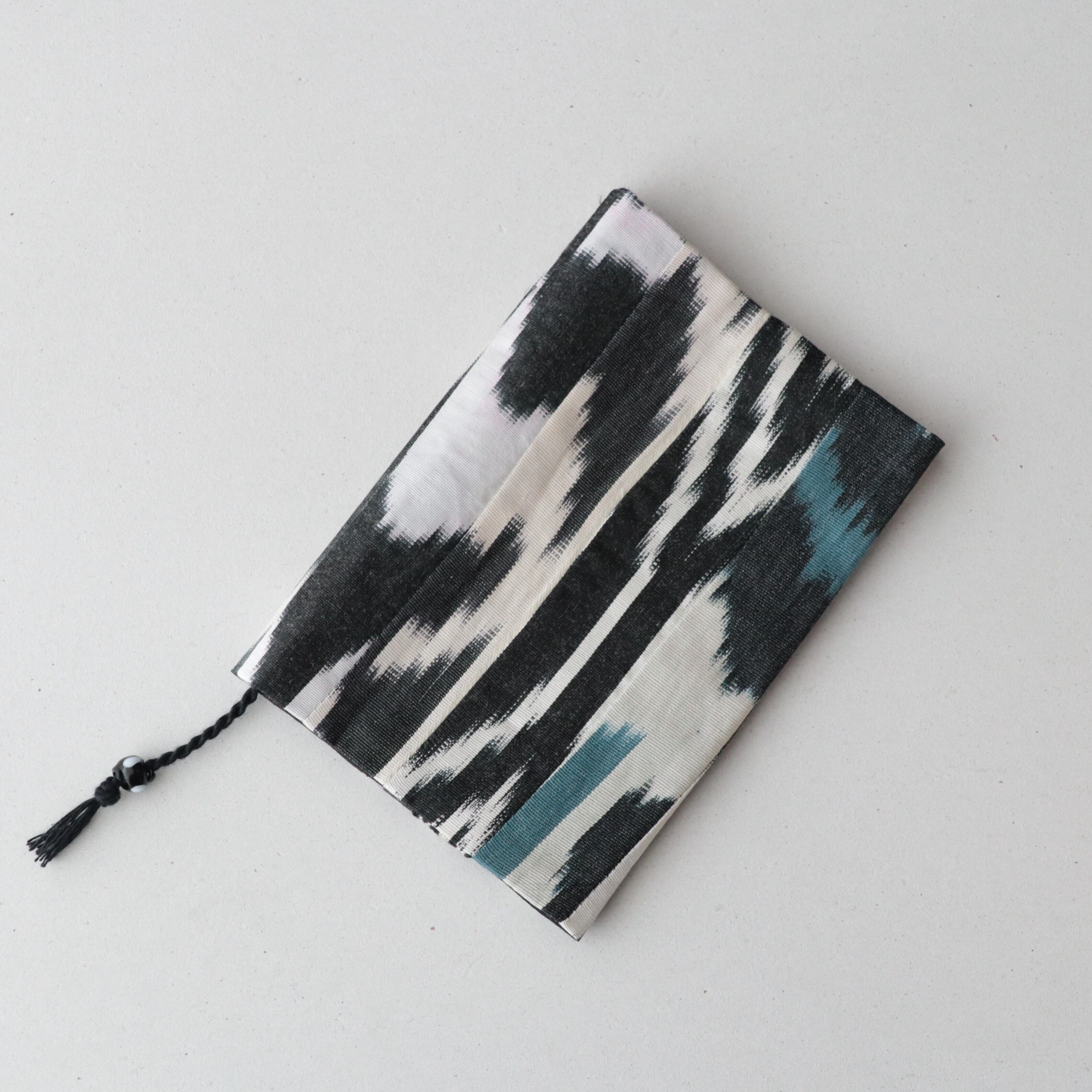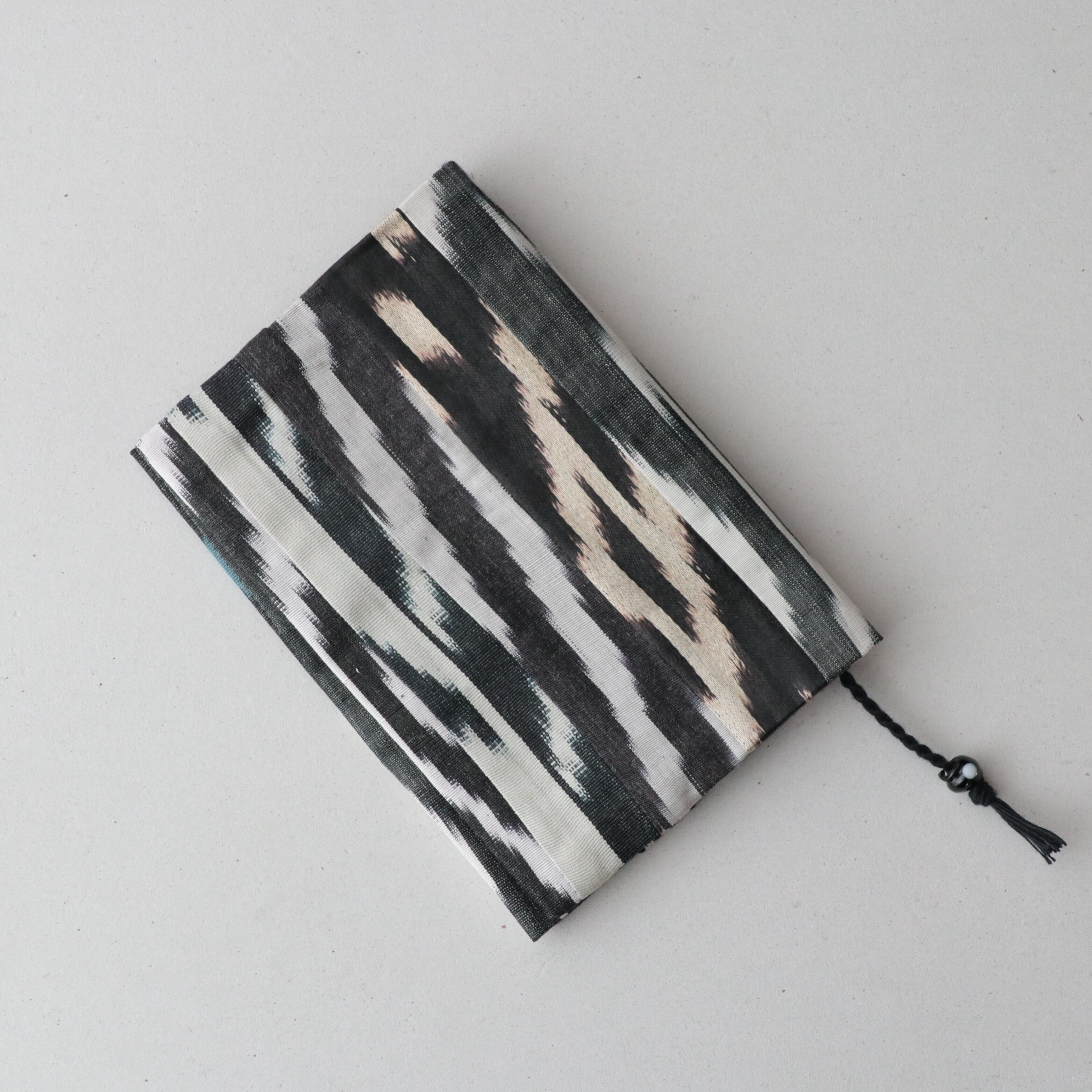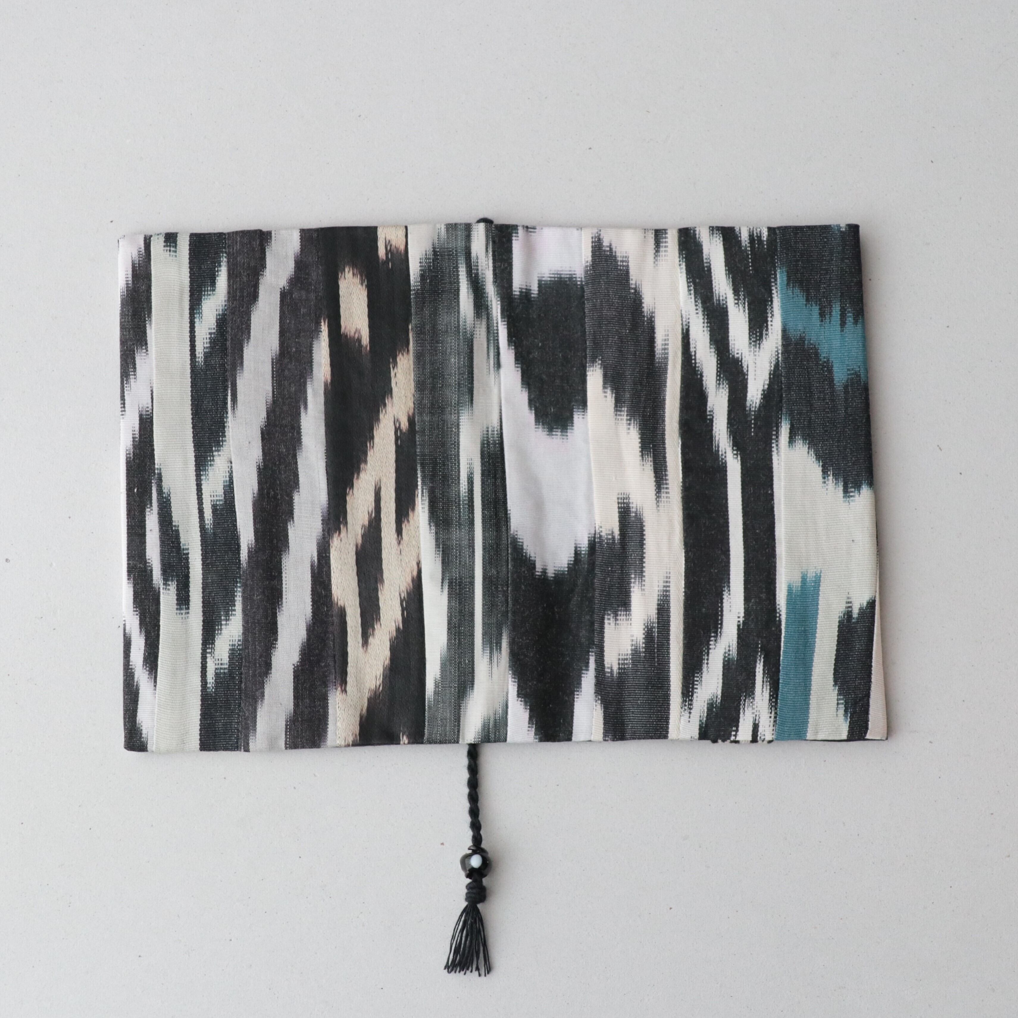 手織りイカット(絣)の端布をパッチワークにし、ブックカバーを作りました。
