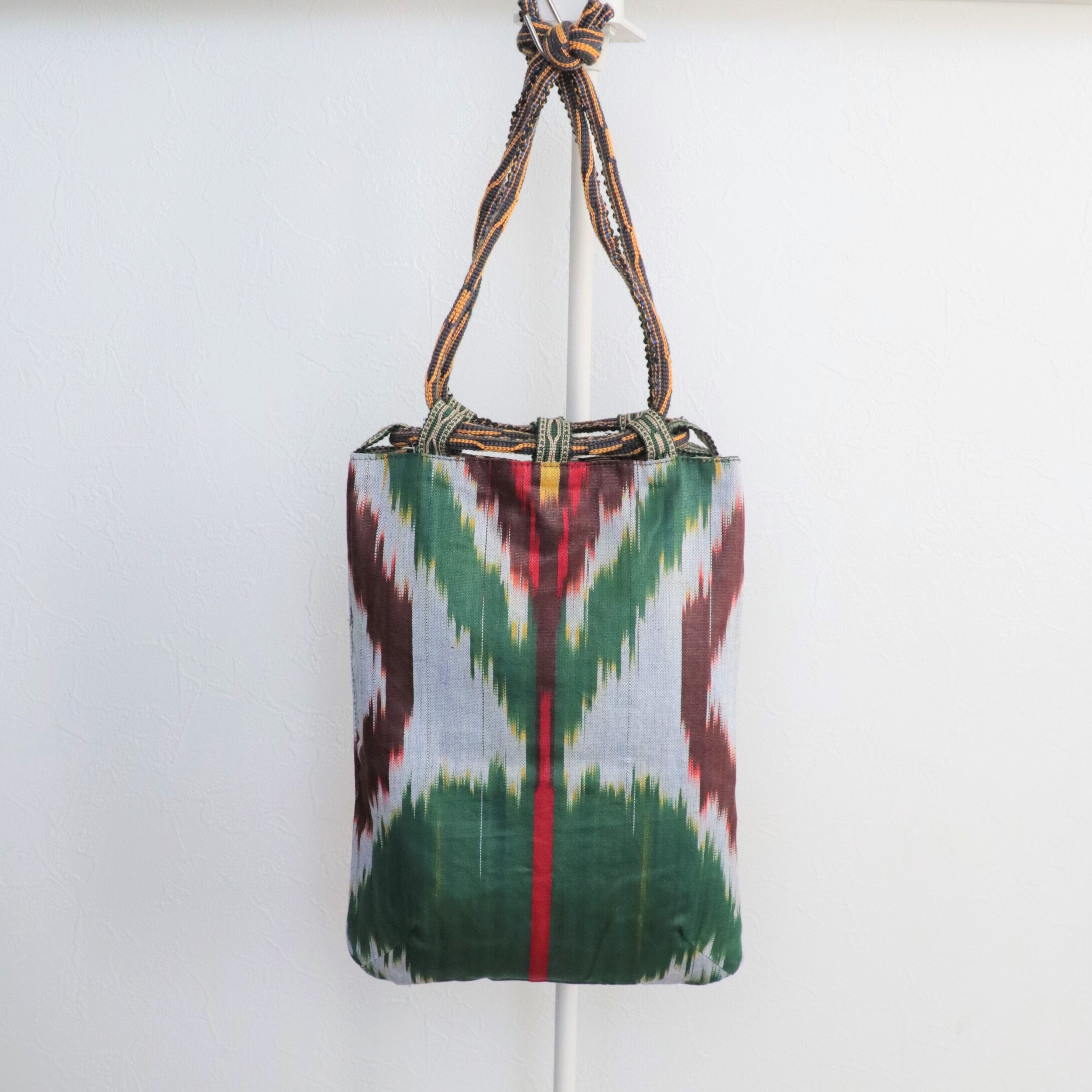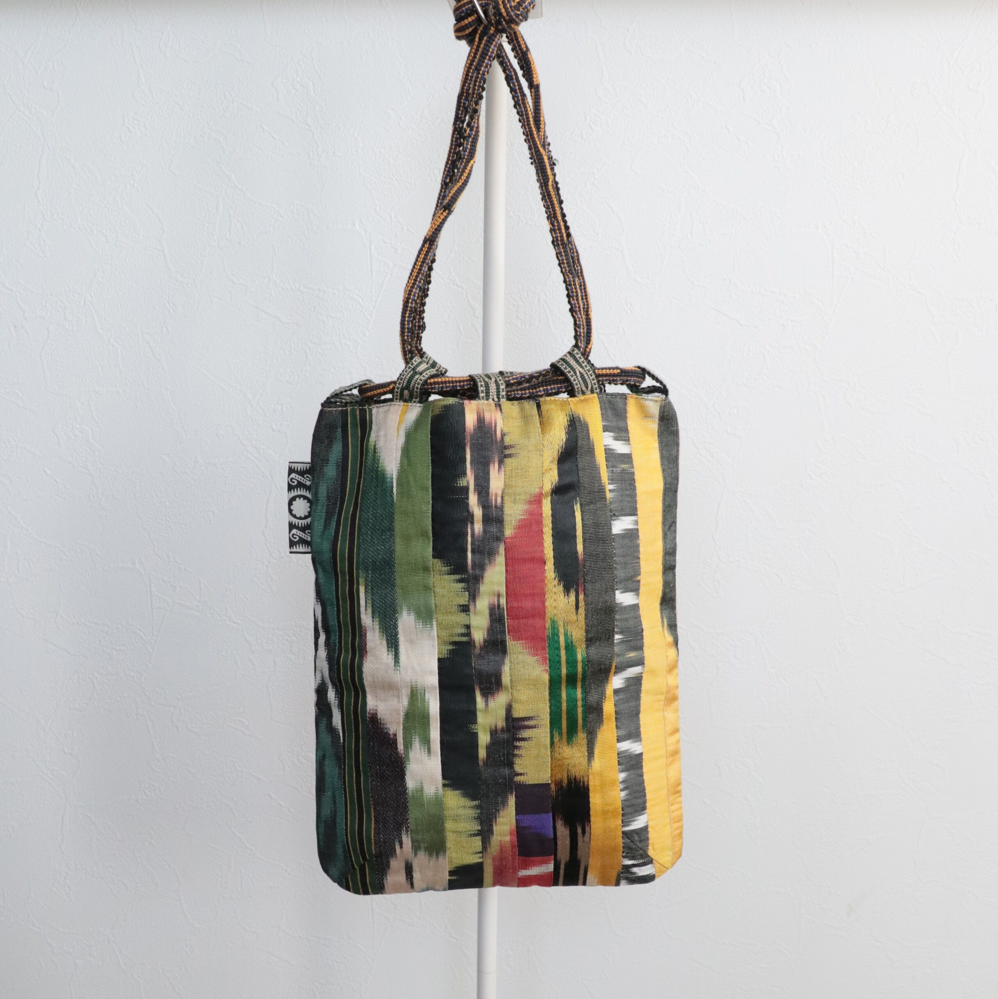 表は端切れイカット(絣)のパッチワーク、裏はコットン100%の手織りイカットを使った巾着。