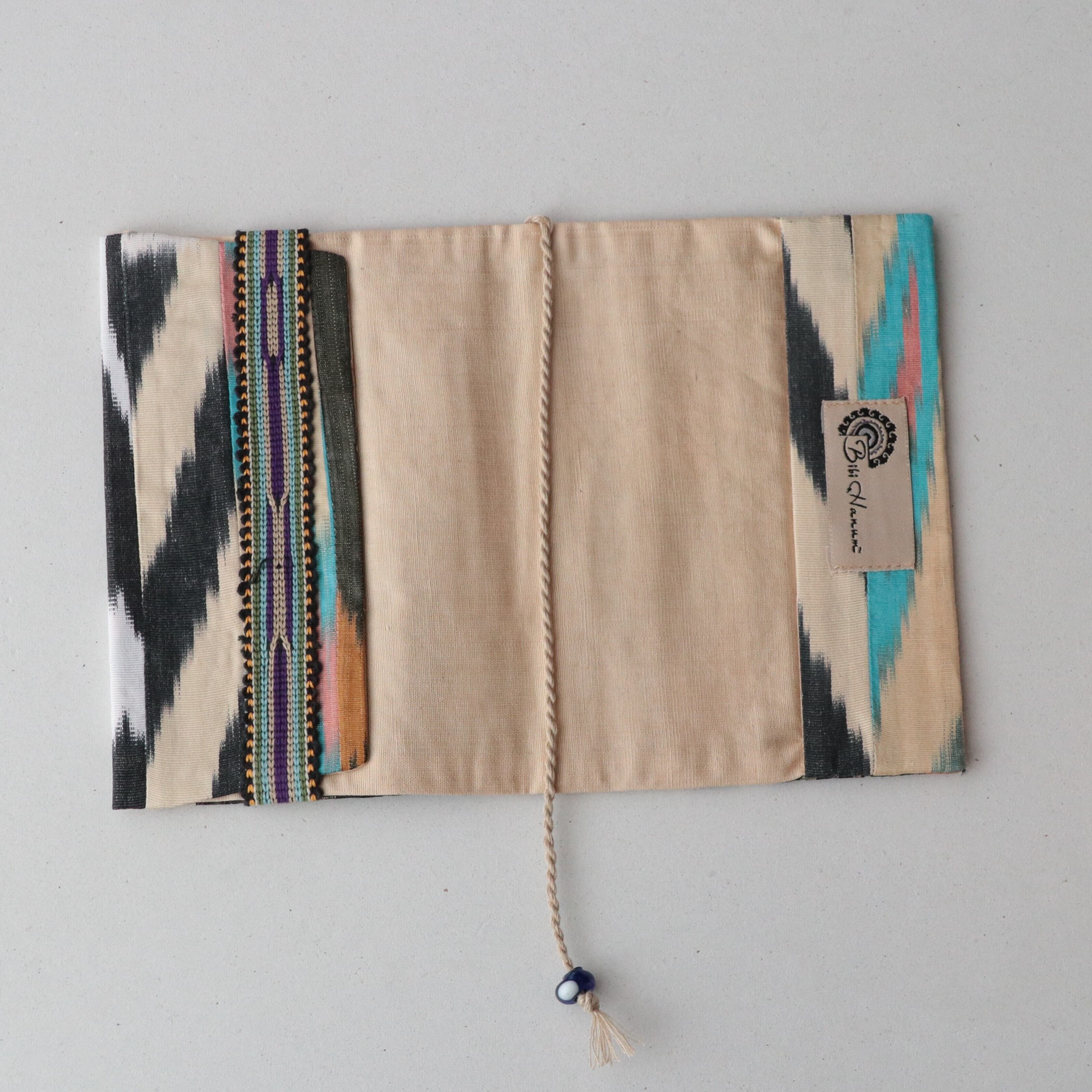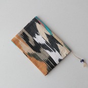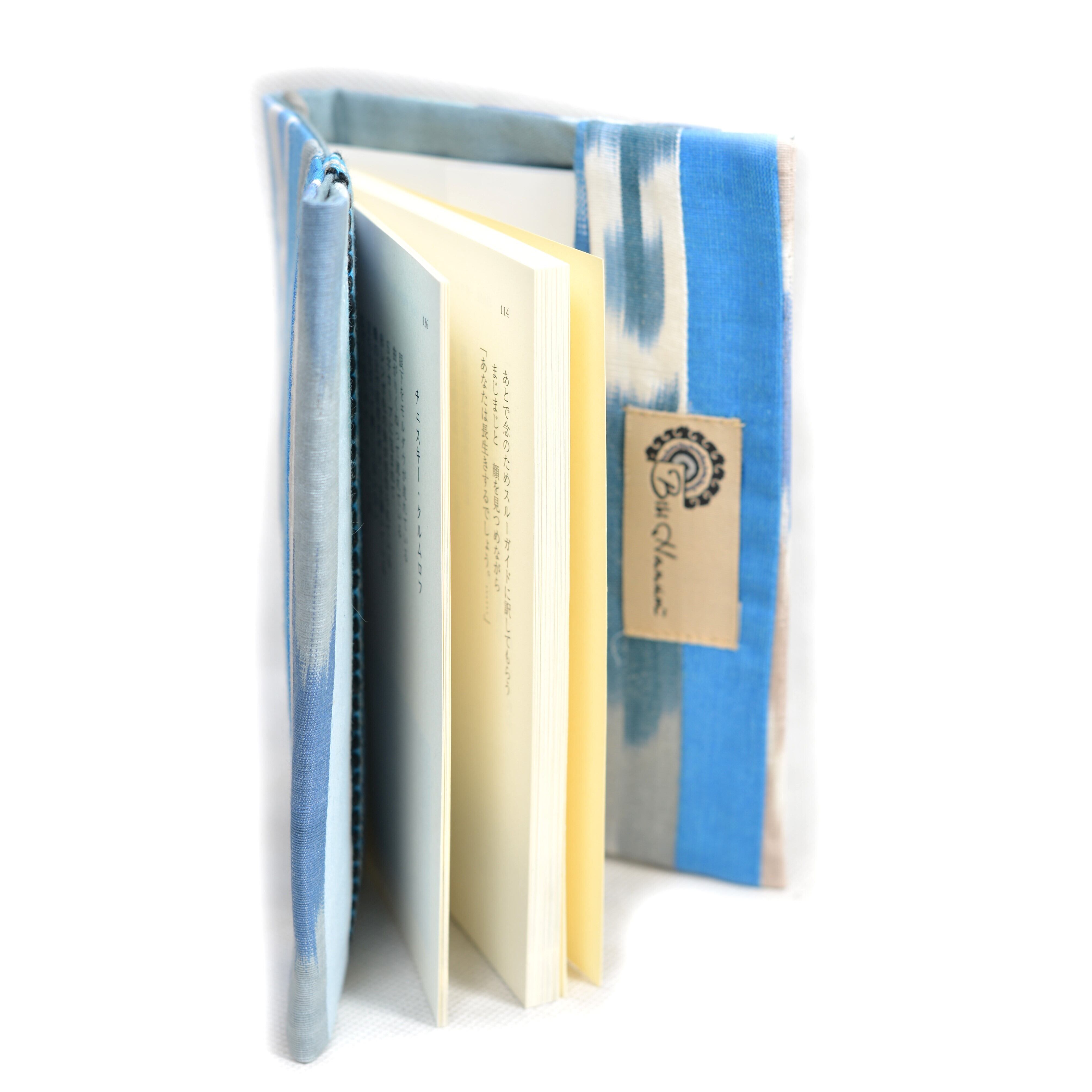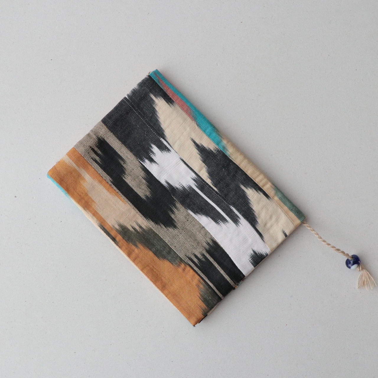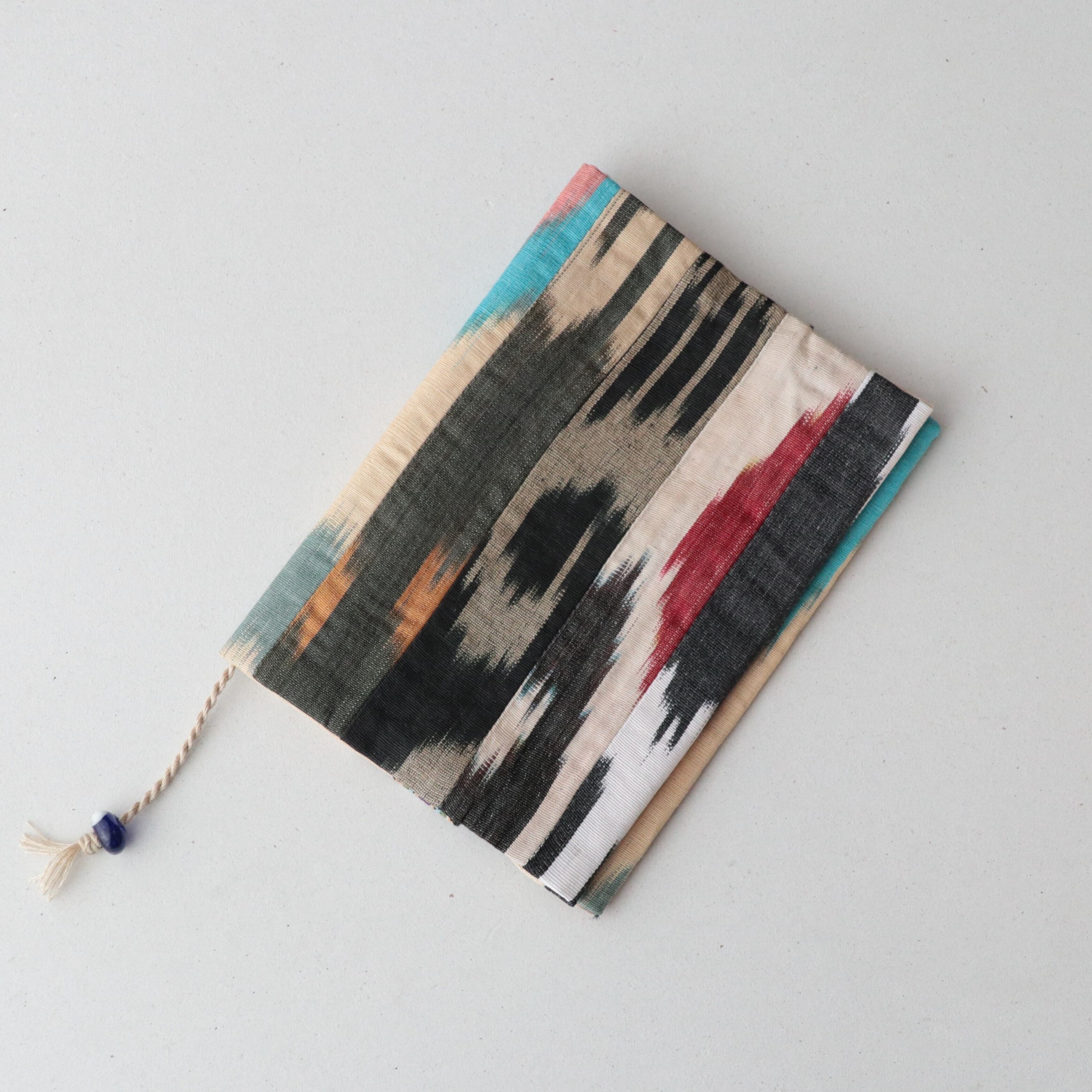 手織りイカット(絣)の端布をパッチワークにし、ブックカバーを作りました。