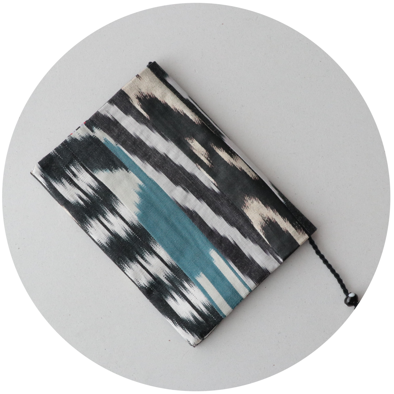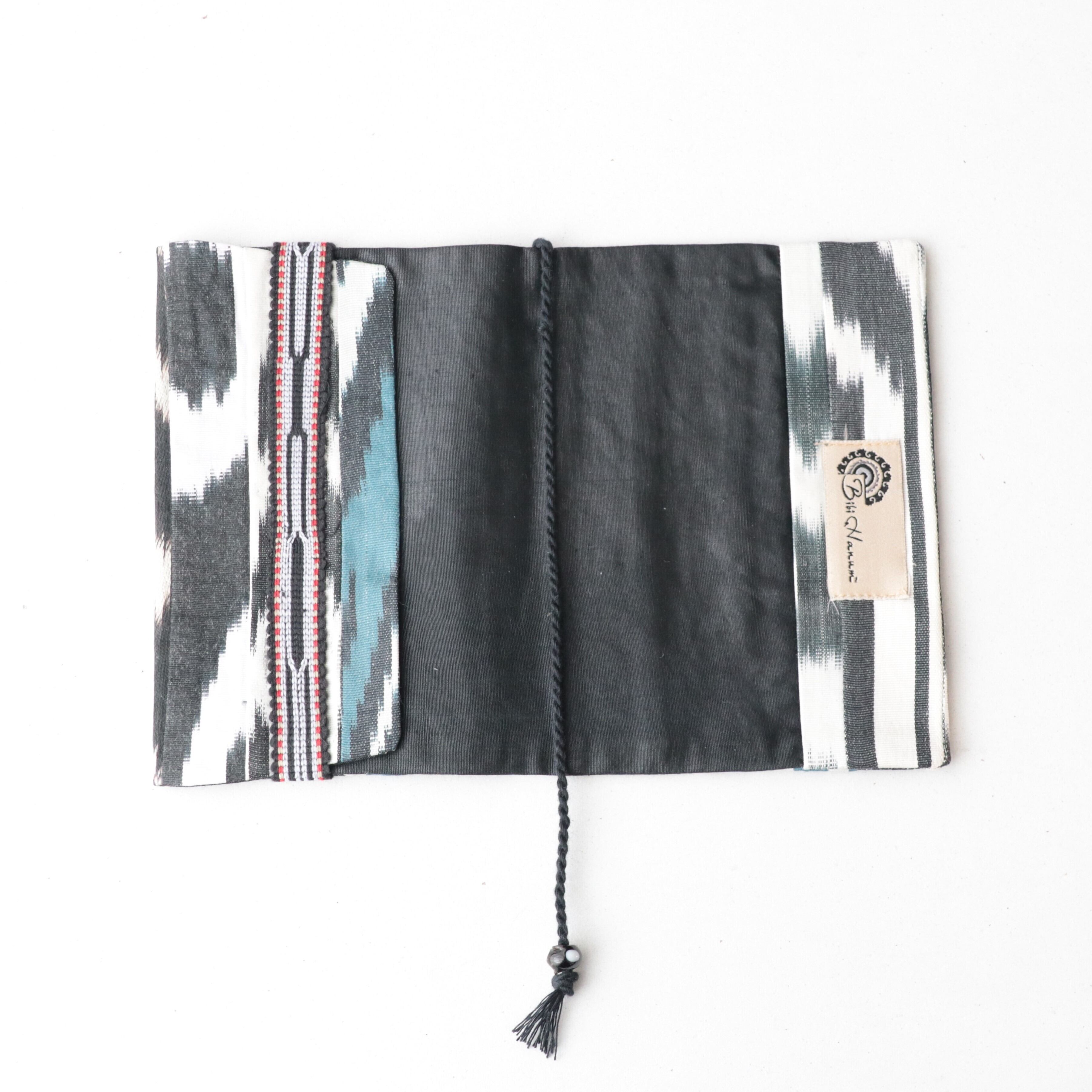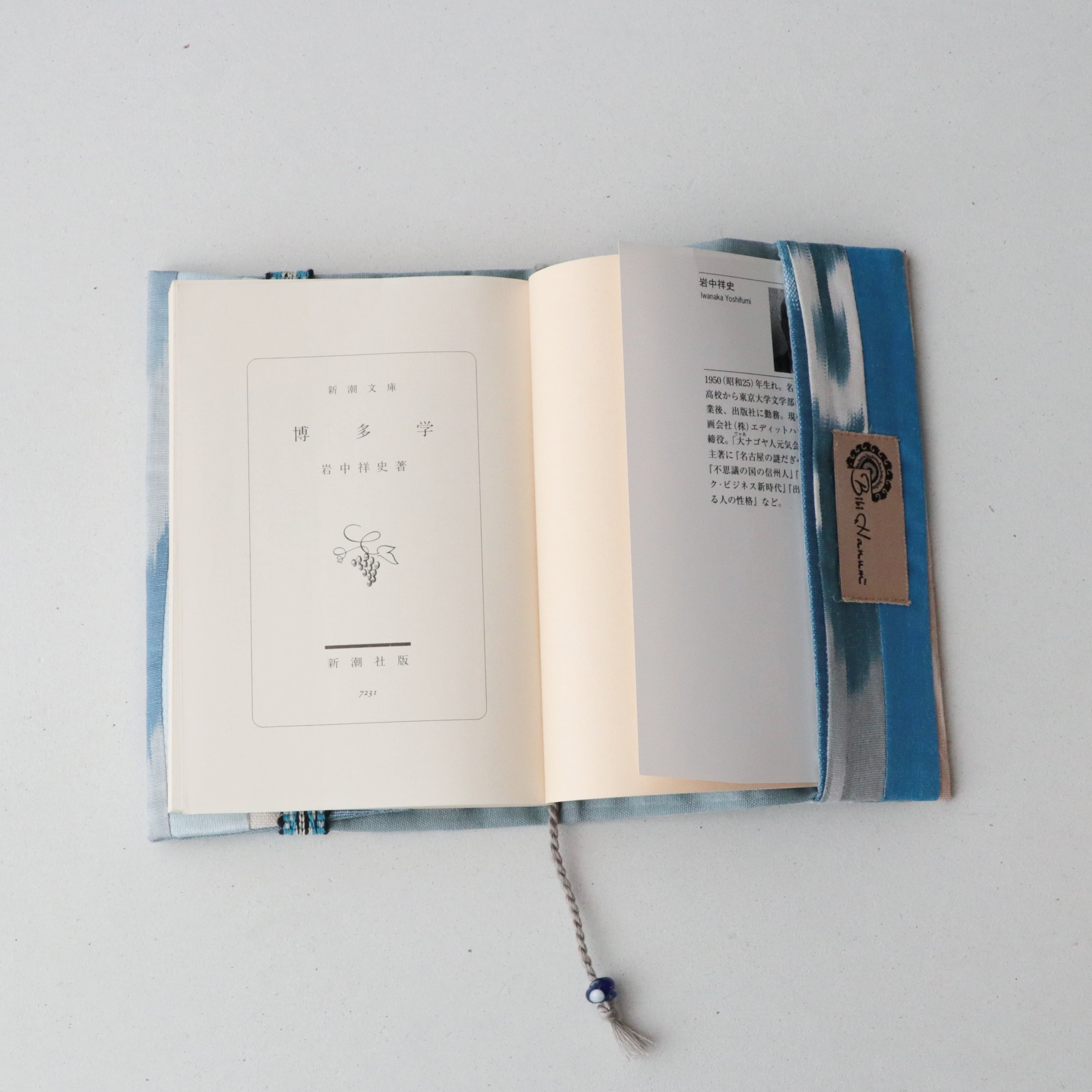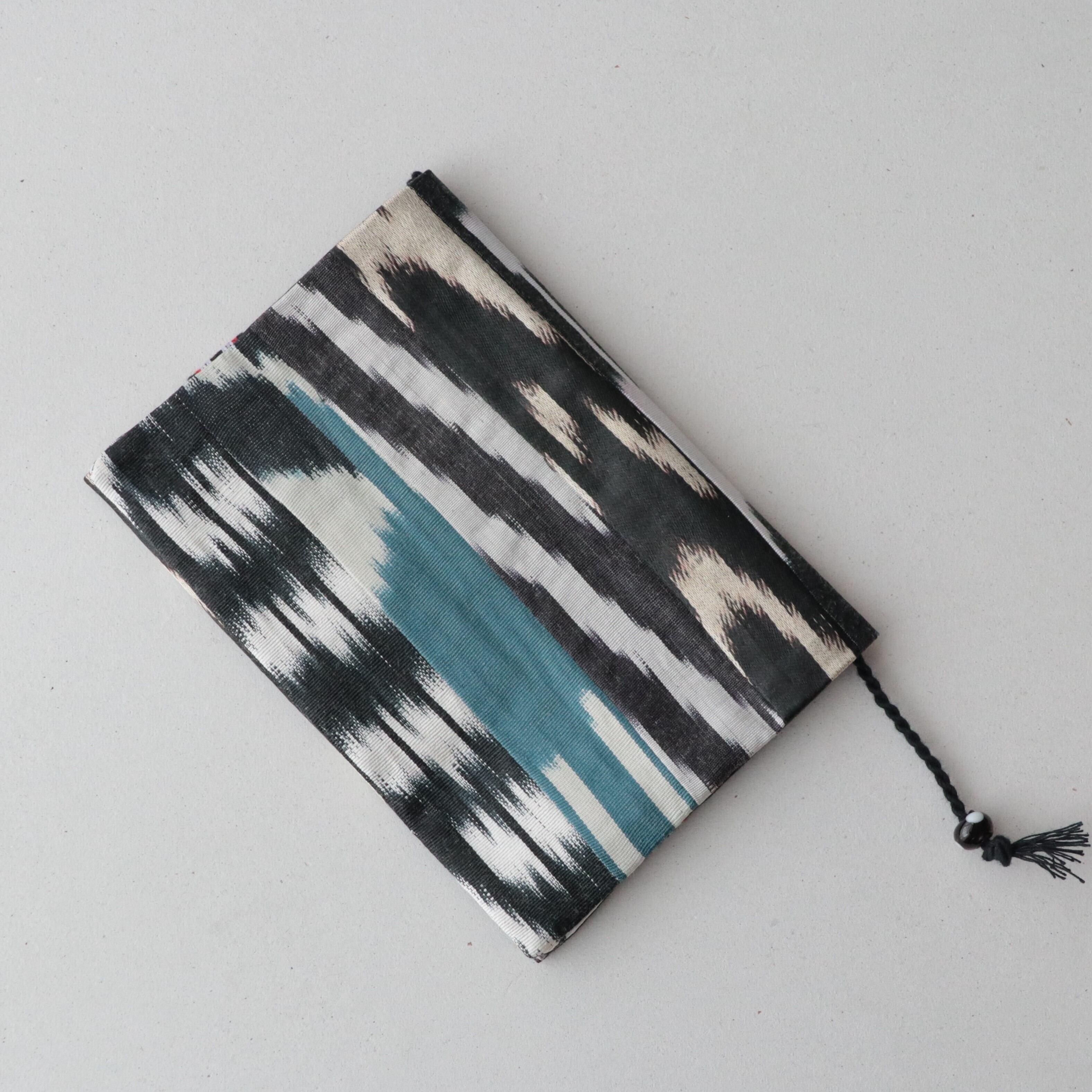 手織りイカット(絣)の端布をパッチワークにし、ブックカバーを作りました。