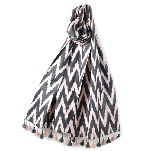 淡いピンクと黒のジグザグ模様と、シルク糸のタッセルが印象的な軽いスカーフです。