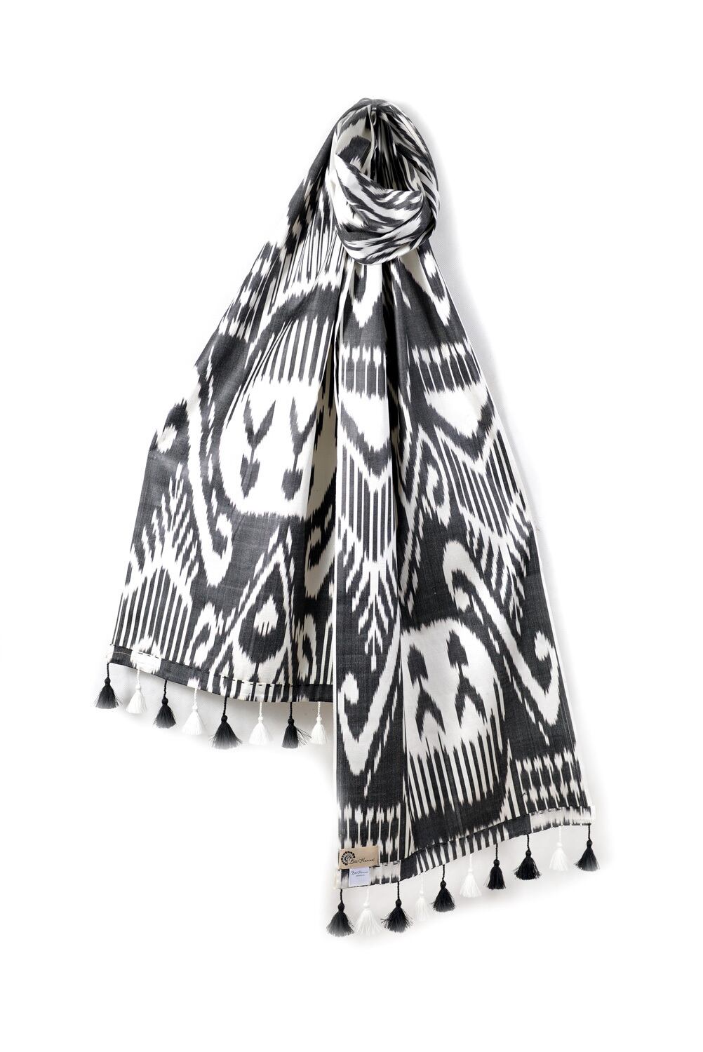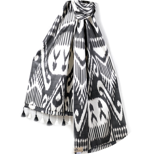 イカット特有の模様とシルク糸のタッセルが印象的な軽いスカーフです。