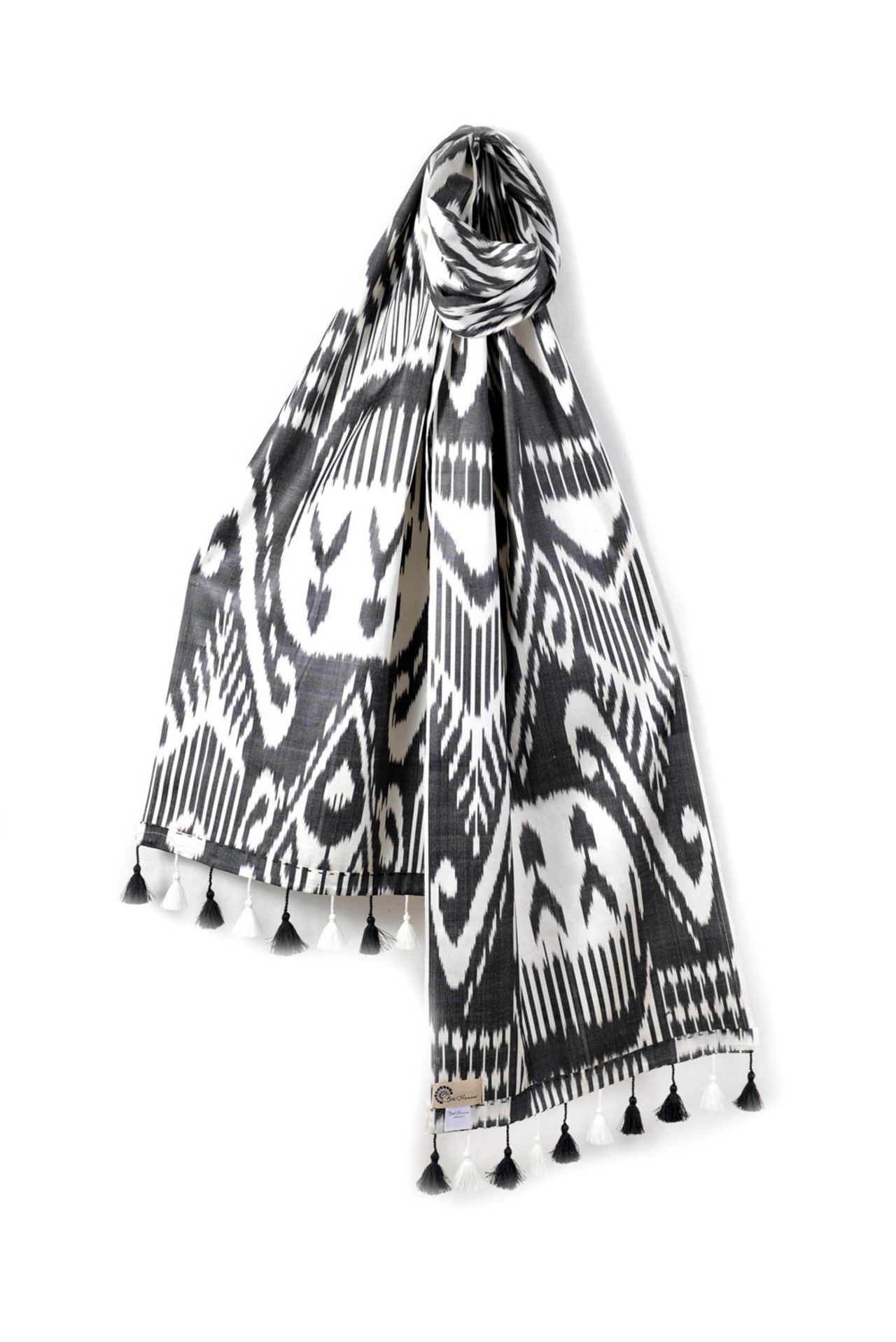 Bibi Hanumオリジナルデザインの手織りイカット(絣)をスカーフに仕立てました。