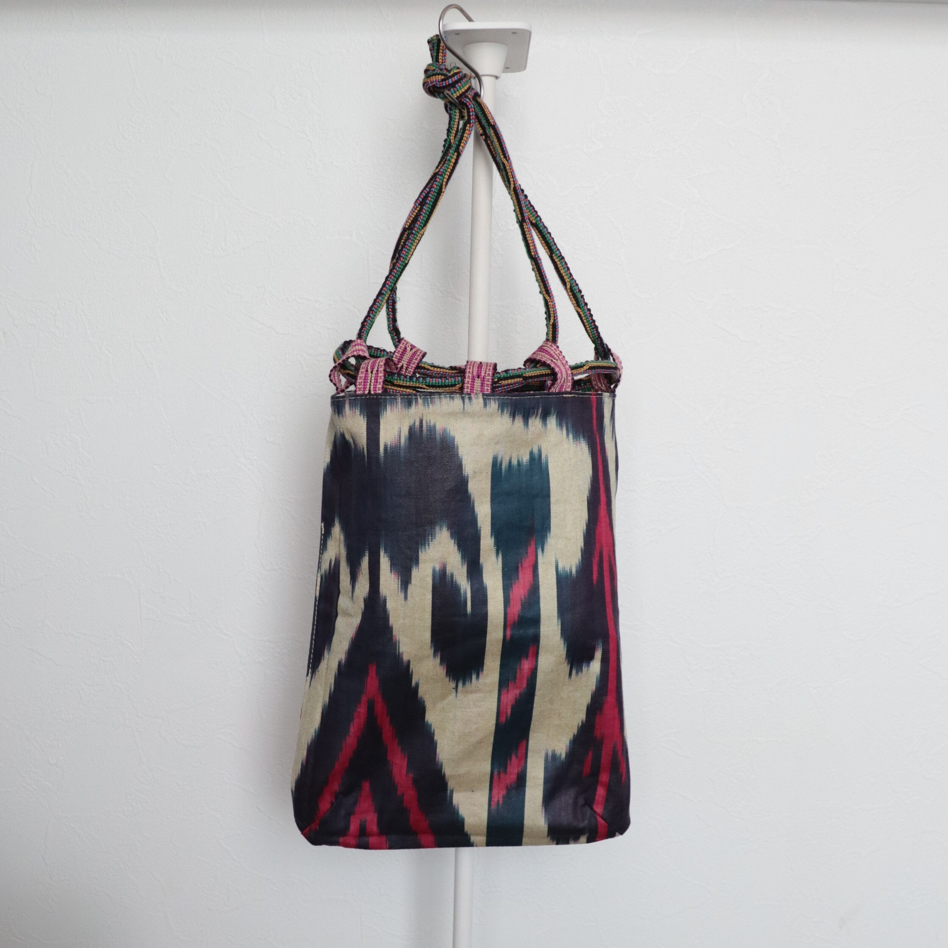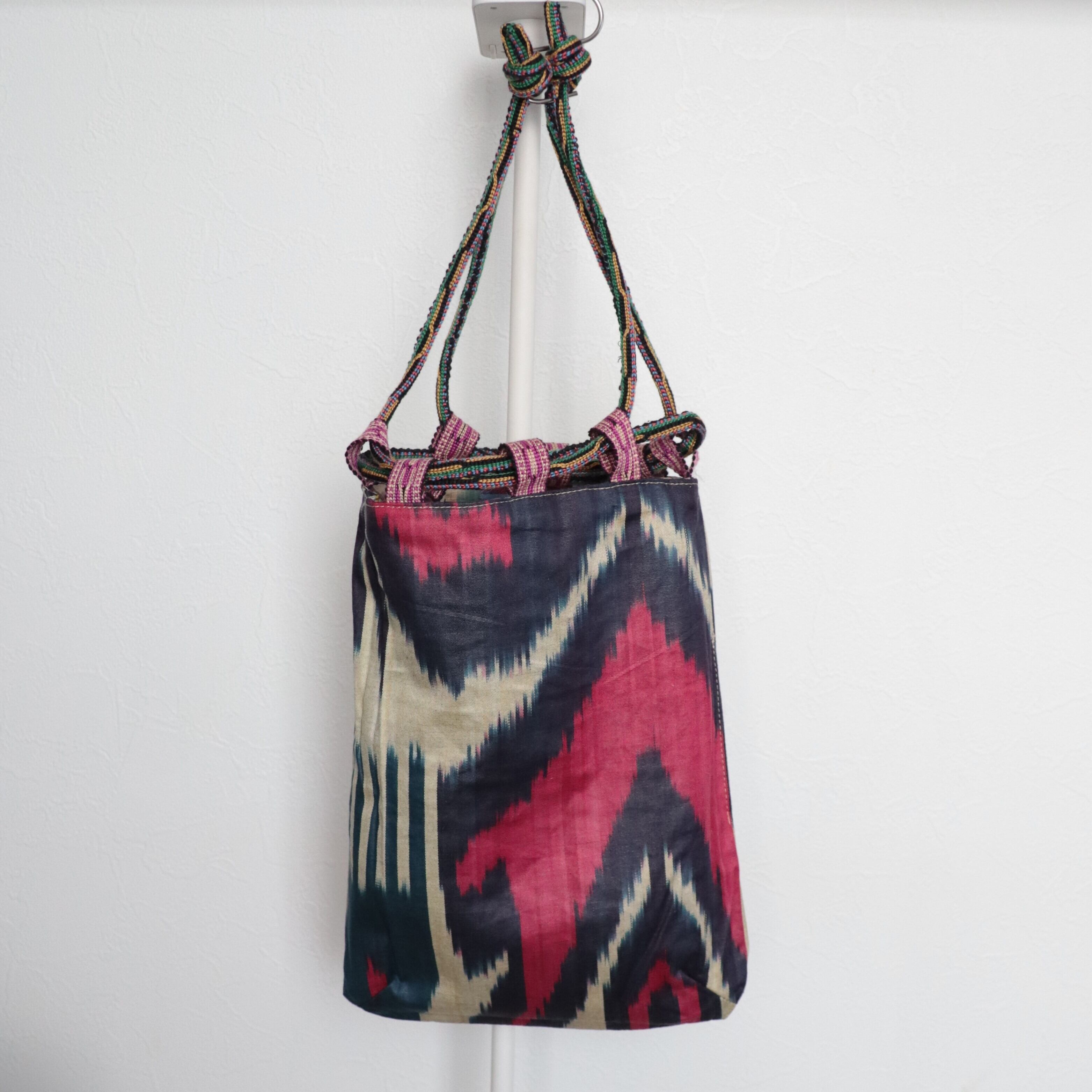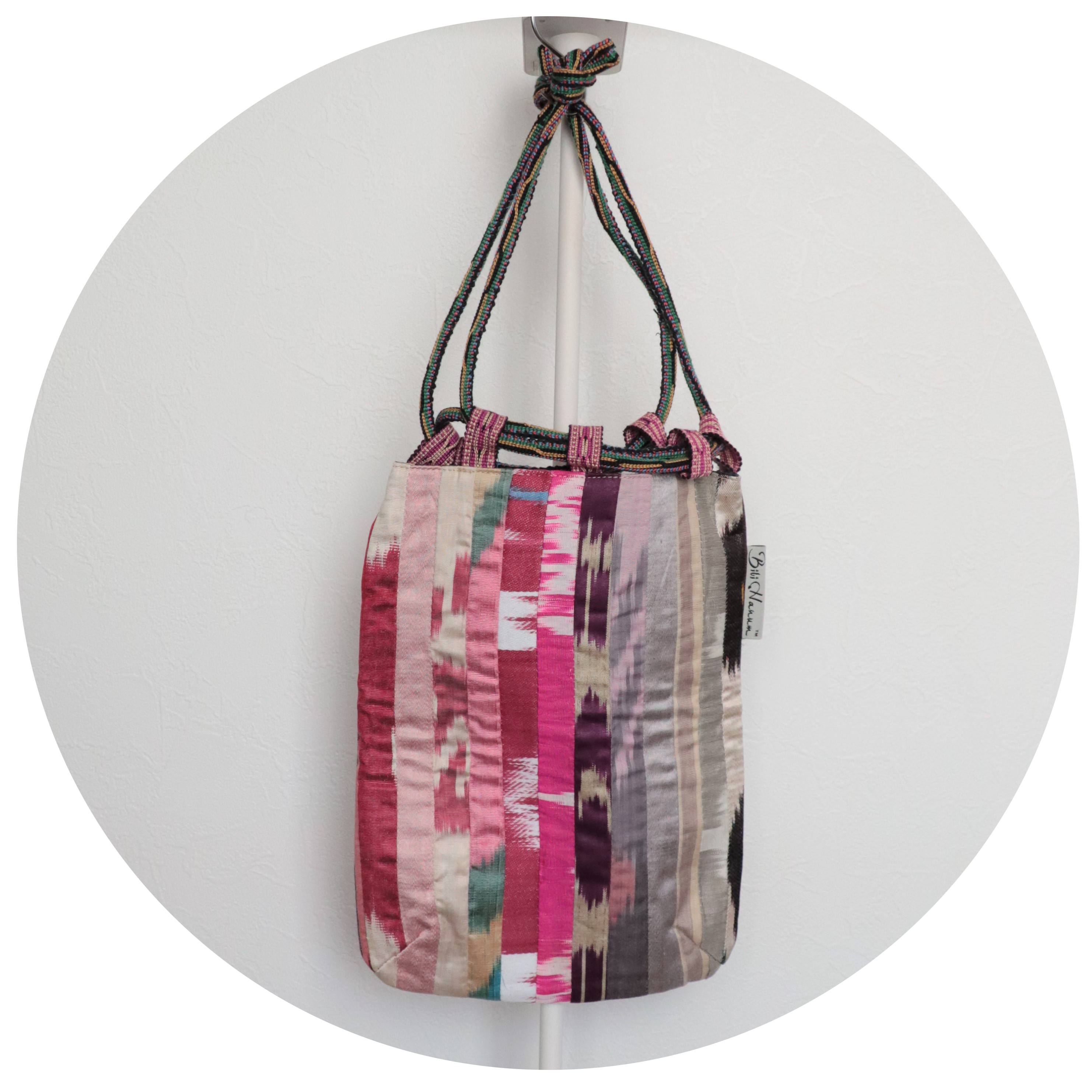 表は端切れイカット(絣)のパッチワーク、裏はコットン100%の手織りイカットを使った巾着です。