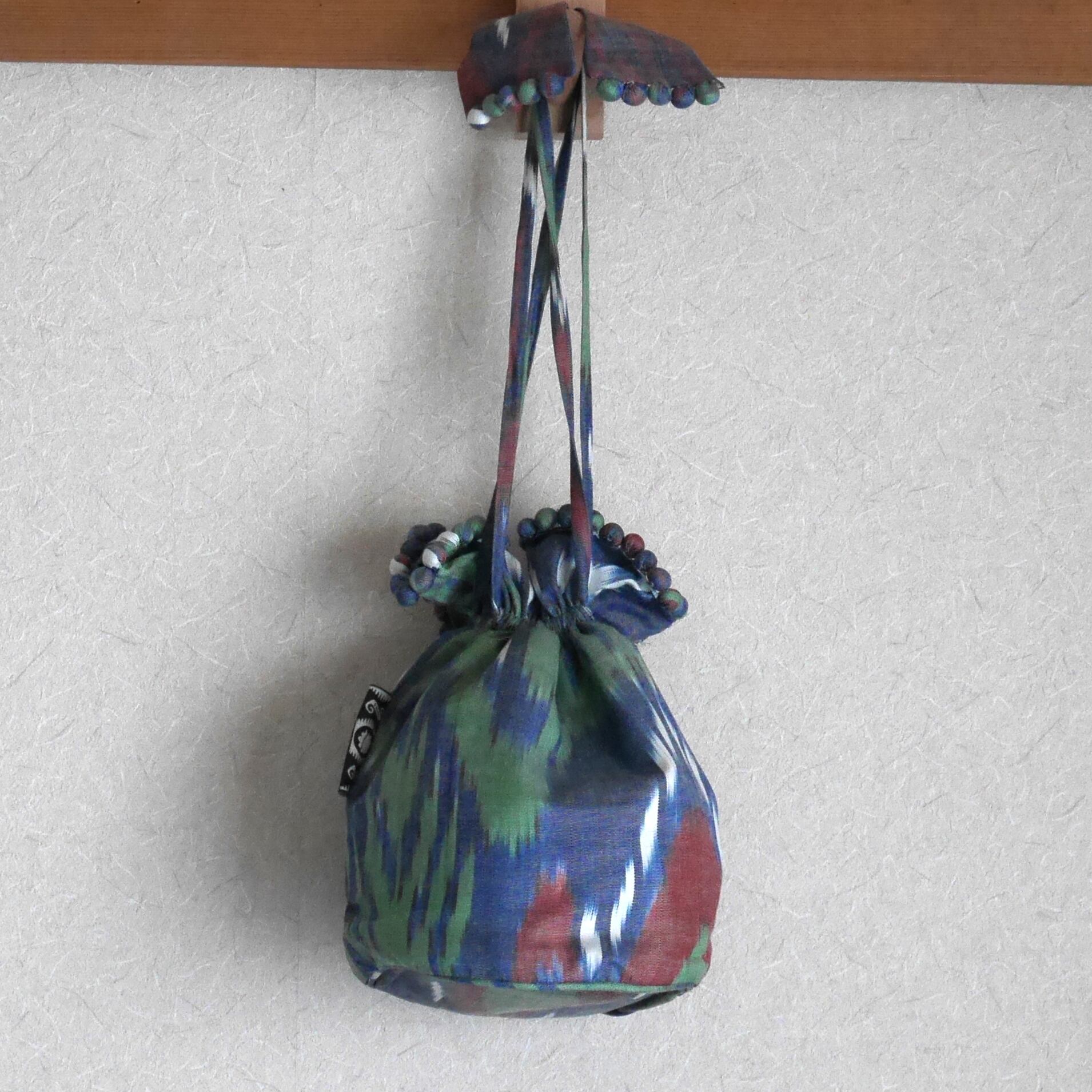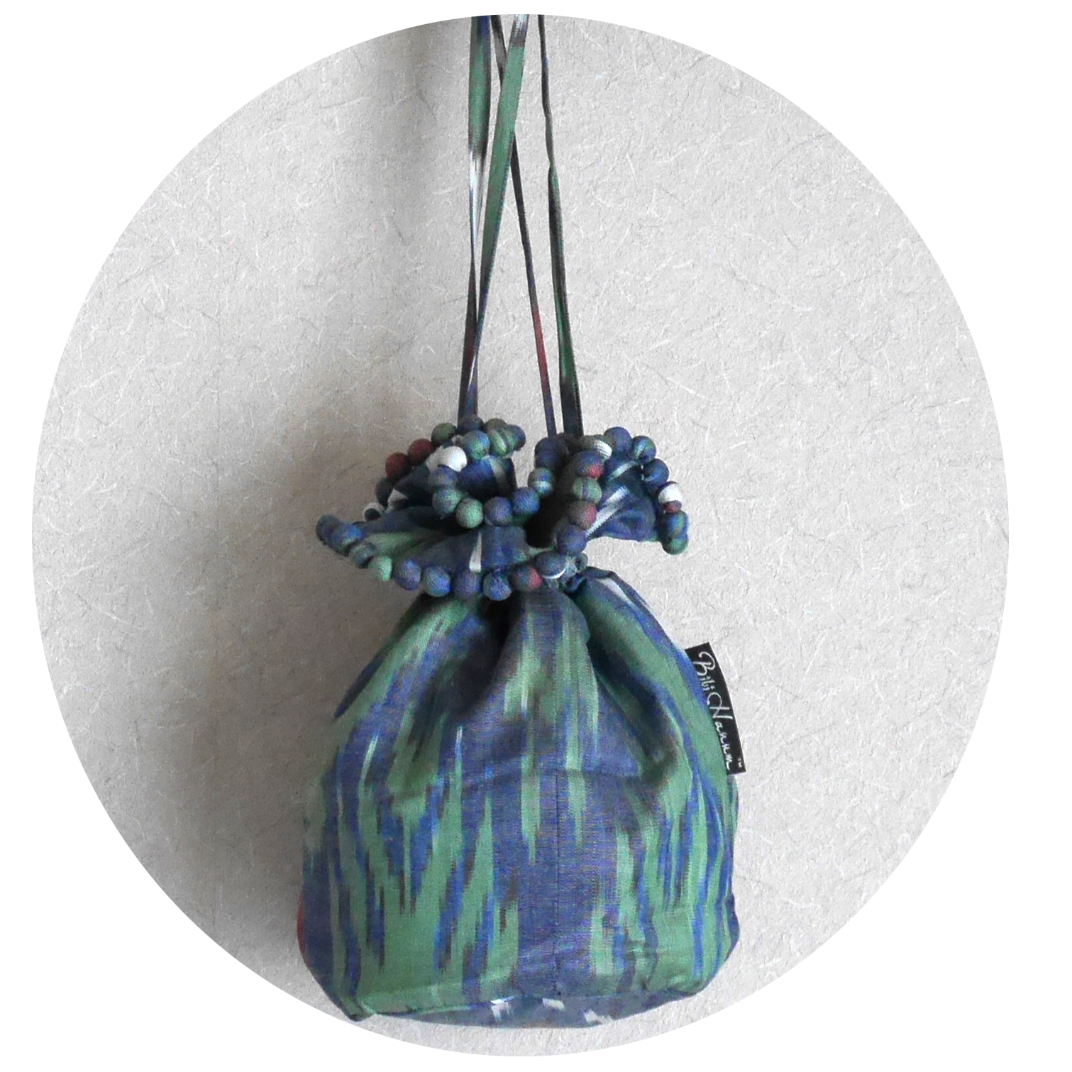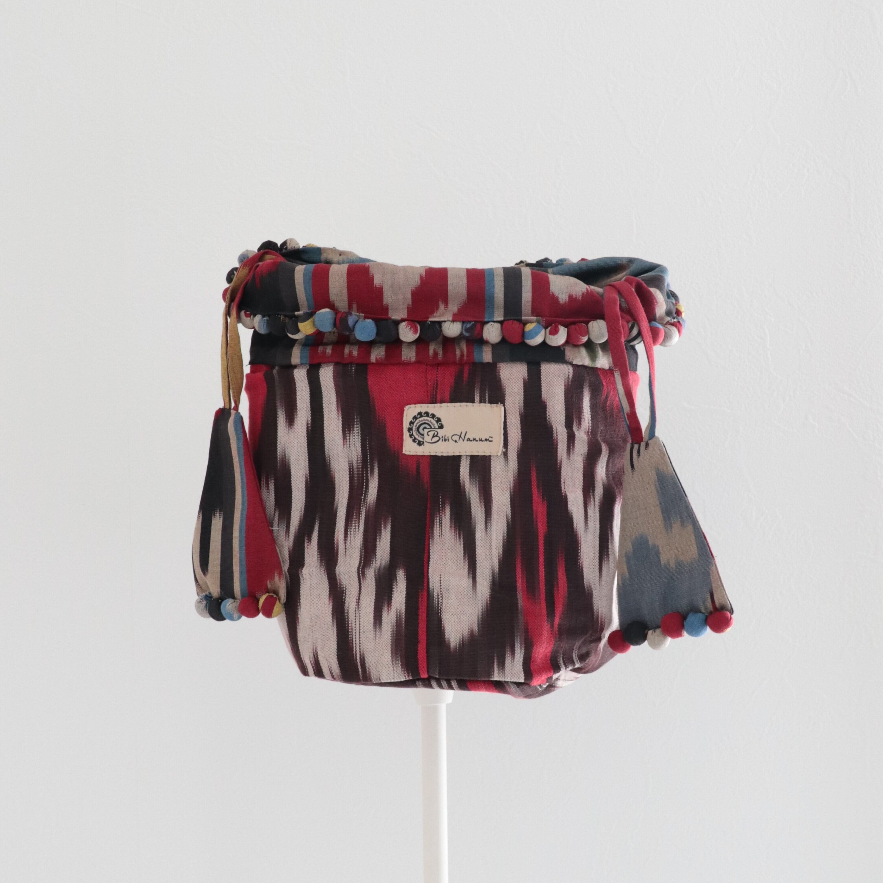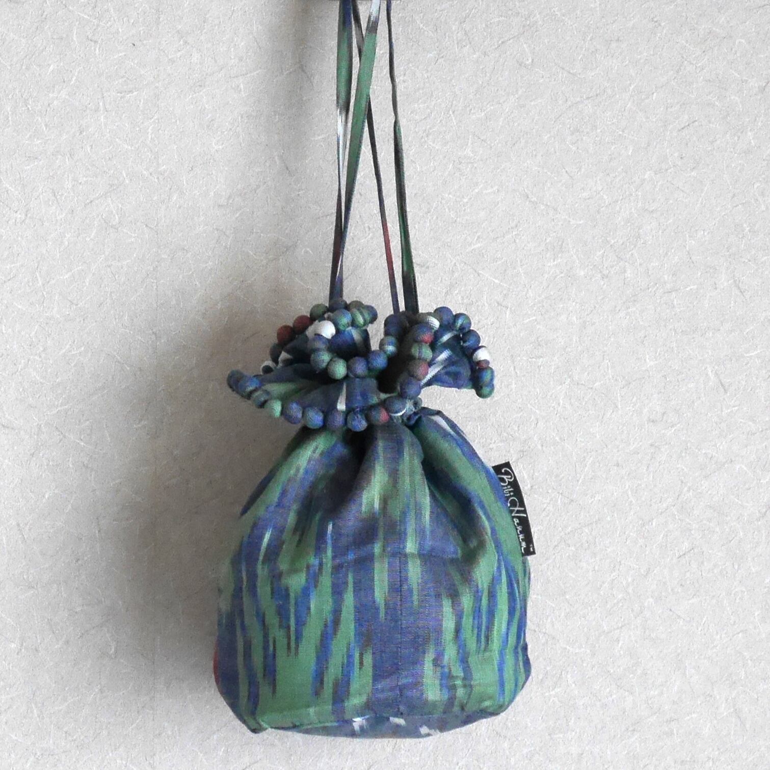 Bibi Hanumオリジナルデザインの手織りイカット(絣)を使った、贅沢で個性的な形の巾着。
